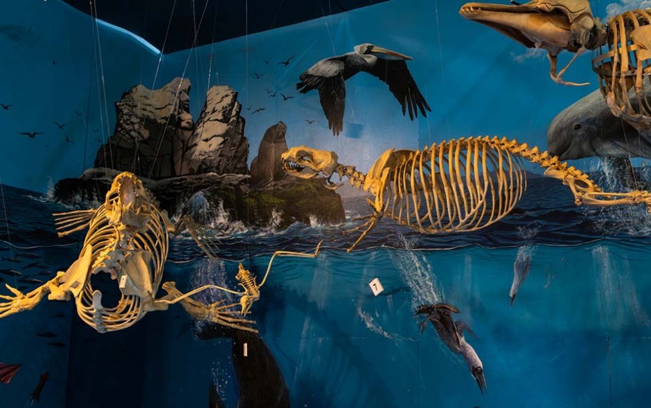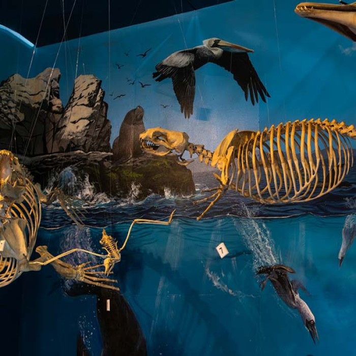 En este recorrido temático conoceremos la importancia que han tenido los ecosistemas marinos desde el inicio de la vida hasta la actualidad. Visitaremos la sala de paleontología para conocer las especies marinas prehistóricas, la sala de zoología para conocer sobre animales actuales marinos, tanto vertebrados como invertebrados, y finalmente en el mundo marino veremos esqueletos reales de especies de mayor relevancia en el litoral costero peruano.